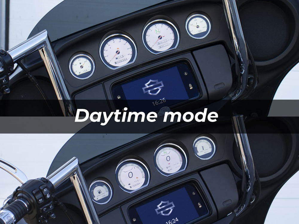 This plug and play TFT gauge set for Harley-Davidson Baggers 2014 to 2023 features a smartphone integration that gives you full control of your dashboard directly from your device. Connect your gauges to your phone with the KOSO K Link app and monitor real-time data of your bike: speed, fuel level, oil temperature, gear indicator, RPM, best performance, horsepower, tire pressure and more. You can even see your vehicles location on the app and never have to search for it again in crowded places!